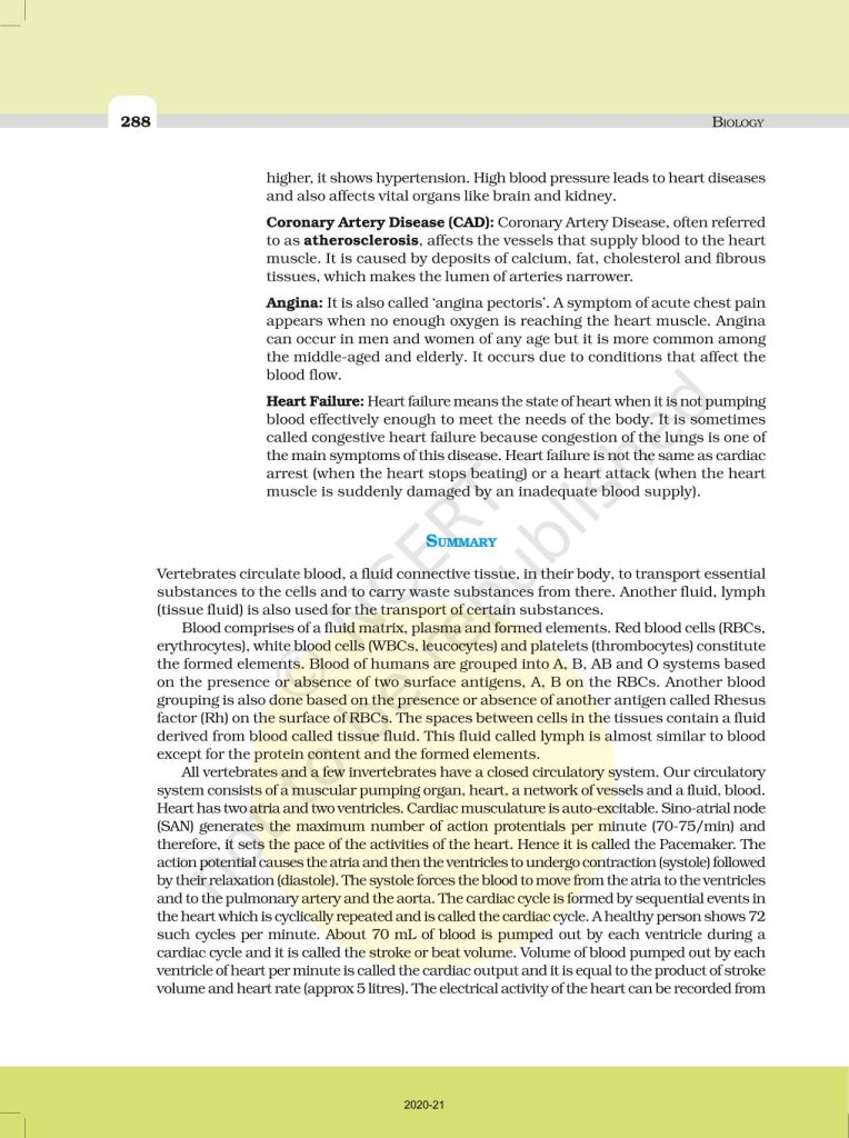 The chapter describes the composition of blood (plasma, RBCs, WBCs, and platelets), blood groups (ABO and Rh factor), and the process of blood clotting. It also explains the structure of the human heart, cardiac cycle, electrocardiogram (ECG), and the pathway of blood circulation through pulmonary and systemic circulation.