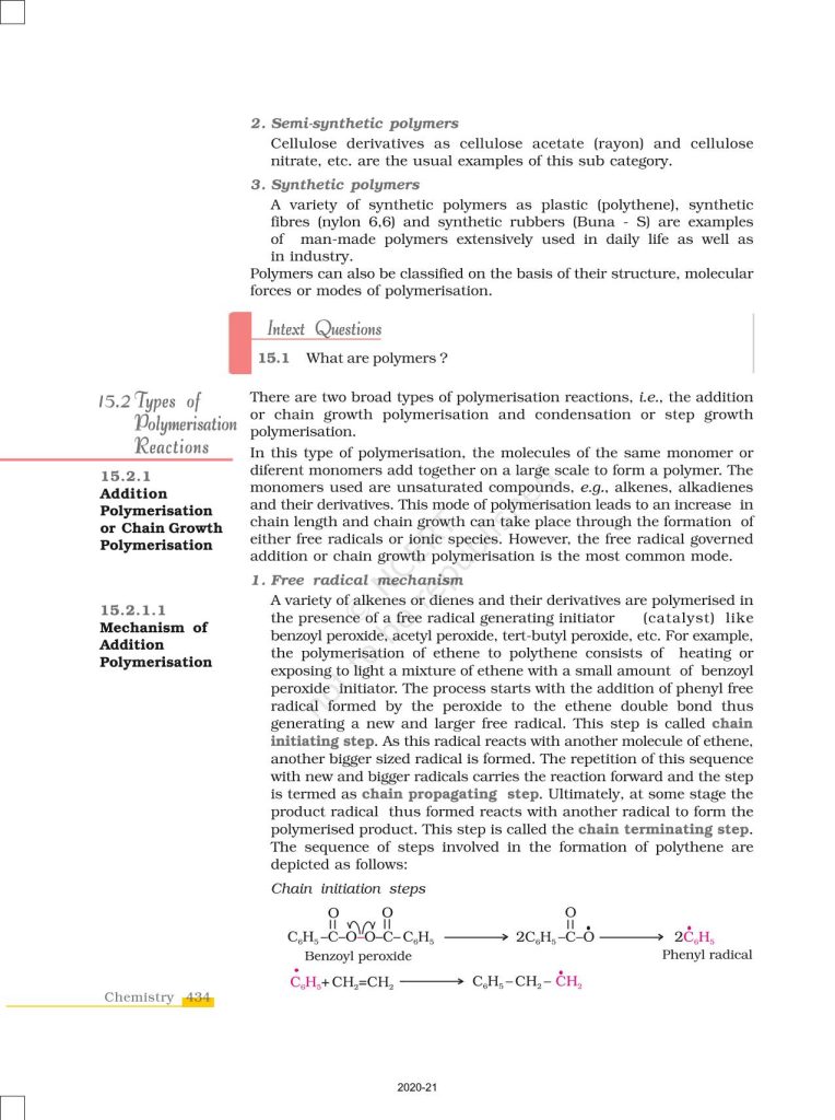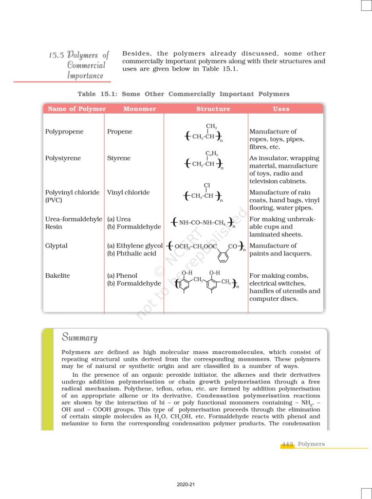 The chapter Polymers explains large molecules formed by the repeated joining of small units called monomers. It introduces different types of polymers based on their structure and mode of polymerization, such as addition polymers and condensation polymers. The chapter also classifies polymers into natural, synthetic, and semi-synthetic polymers, along with thermoplastic and thermosetting plastics.