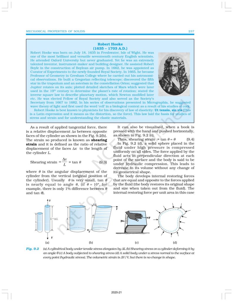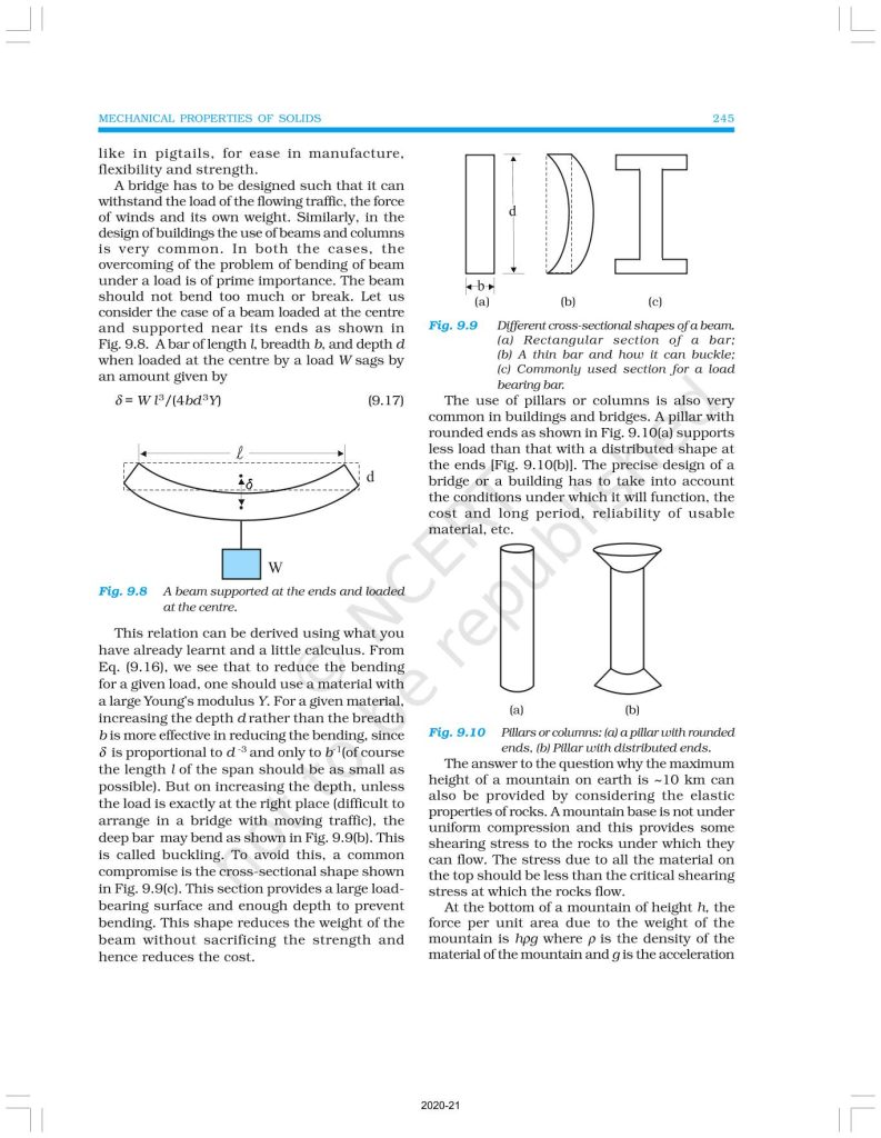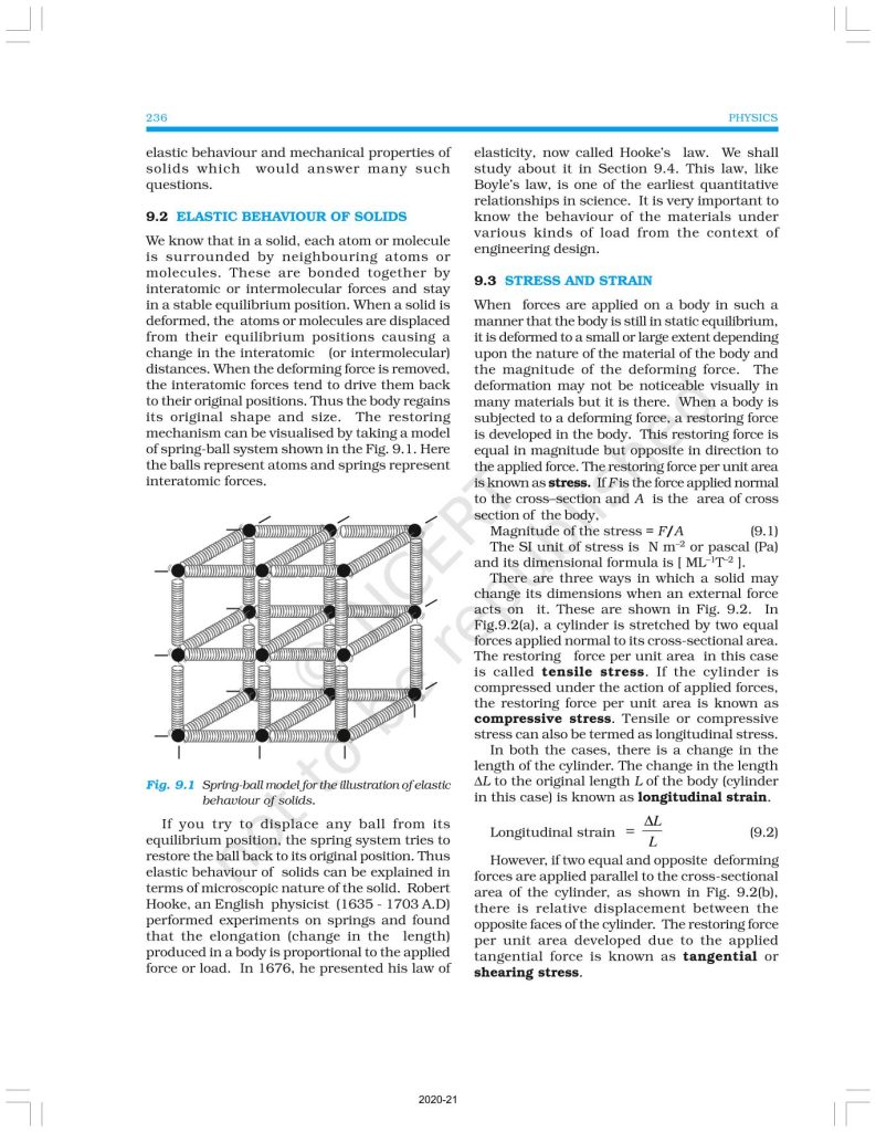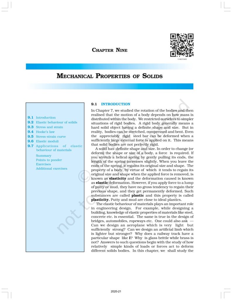 Chapter 9 – Mechanical Properties of Solids explains how solid materials respond to external forces. It introduces concepts such as elasticity, plasticity, stress, and strain, which describe deformation in solids when forces are applied.