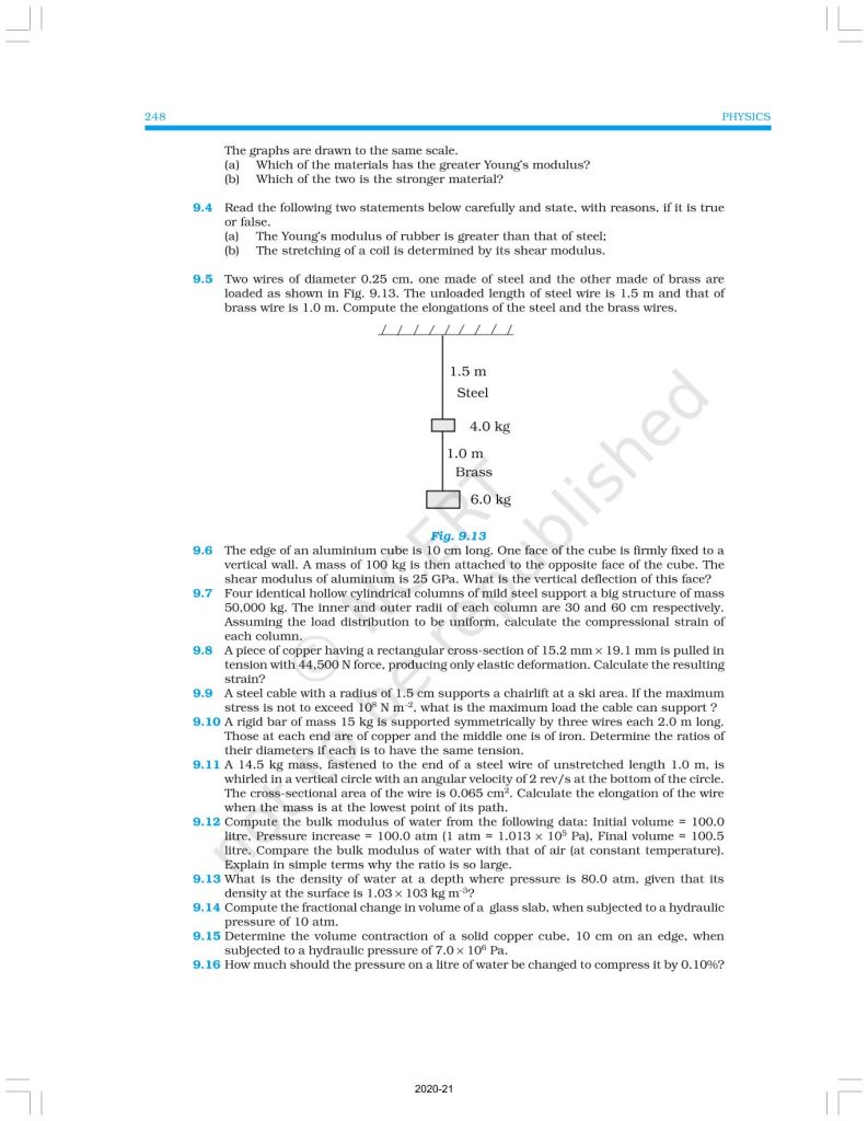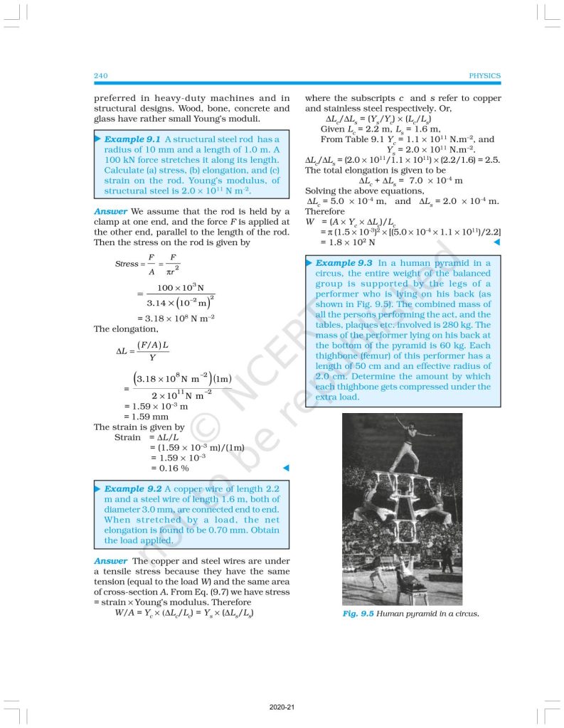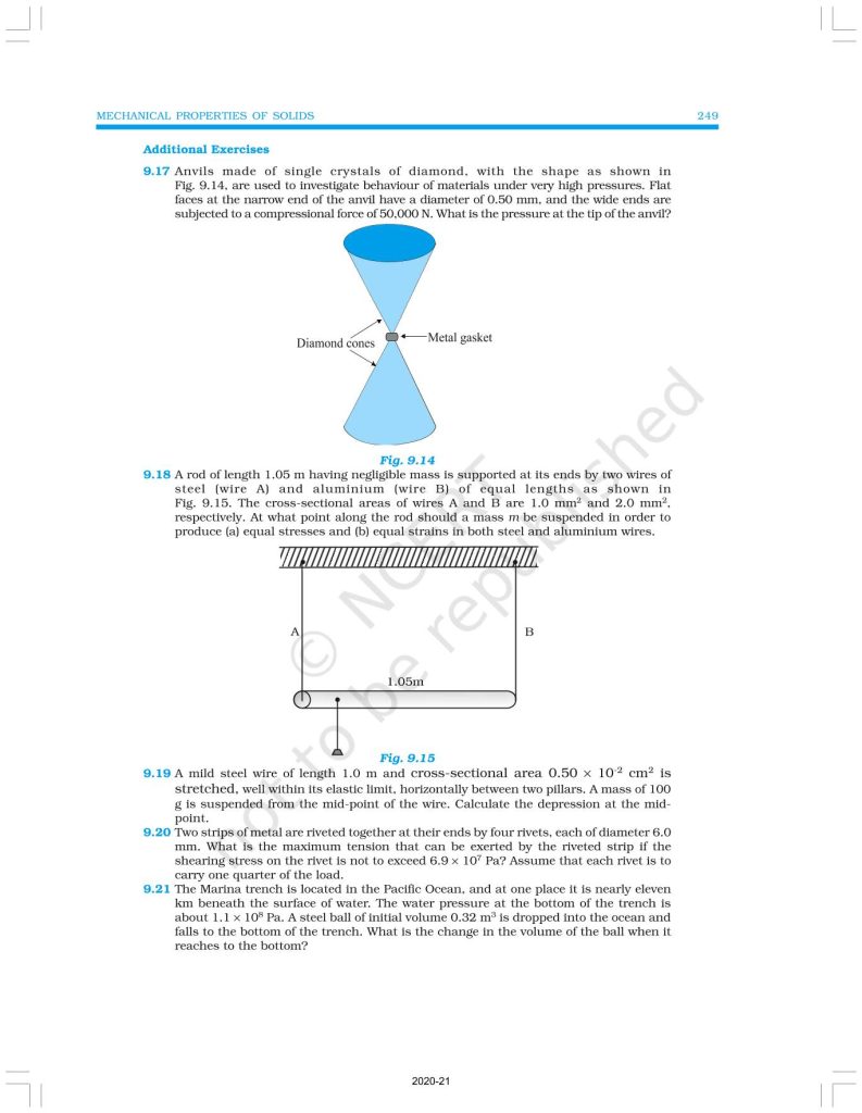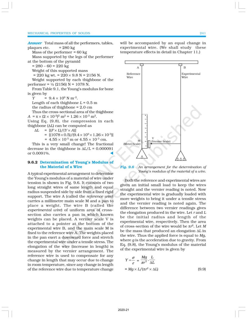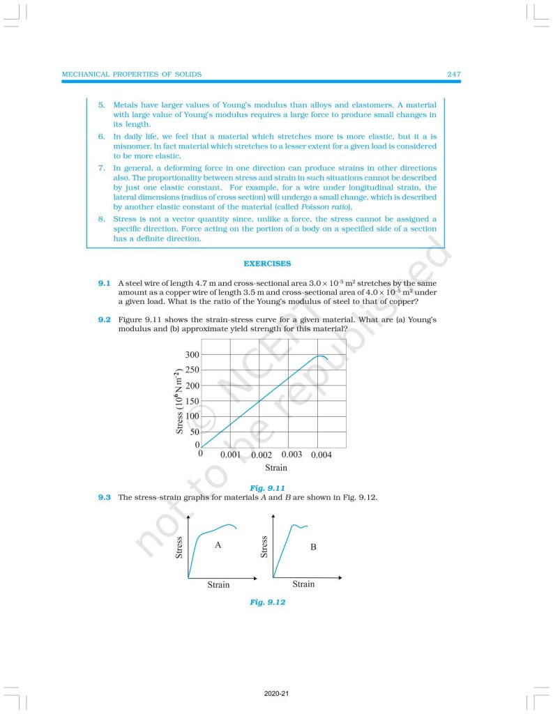 Chapter 9 – Mechanical Properties of Solids explains how solid materials respond to external forces. It introduces concepts such as elasticity, plasticity, stress, and strain, which describe deformation in solids when forces are applied.