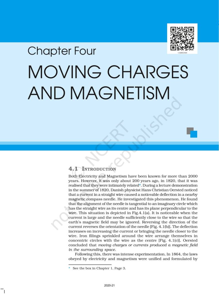 Chapter 4 of NCERT Physics Class 12 explains how moving electric charges produce magnetic fields and interact with them, forming the basis of electromagnetism. It introduces the concept of current as the flow of charges and describes the magnetic field around current-carrying conductors using rules like the right-hand thumb rule. The chapter also covers important laws such as the Biot-Savart Law and Ampere’s Circuital Law, which help calculate magnetic fields in different configurations. Additionally, it explains the force experienced by moving charges and current-carrying conductors in a magnetic field, along with the concept of torque on a current loop, which is essential for understanding the working of devices like electric motors. and it is important for Class 12 board exams and competitive exams like NEET and JEE.