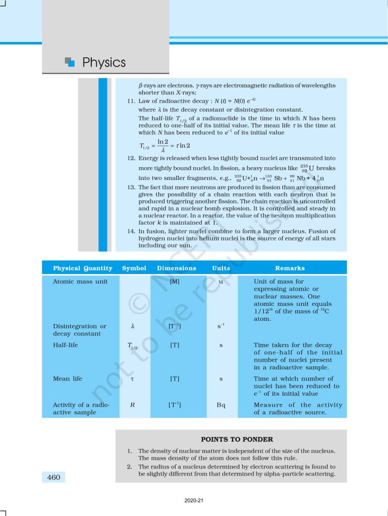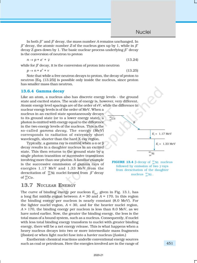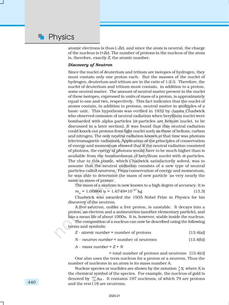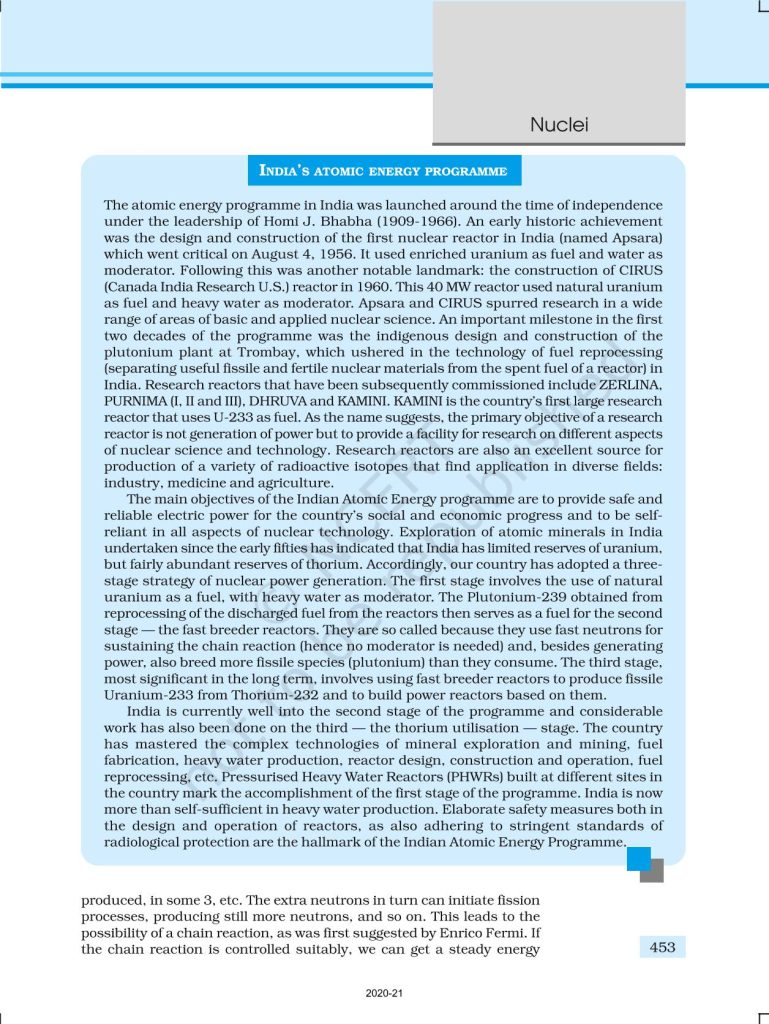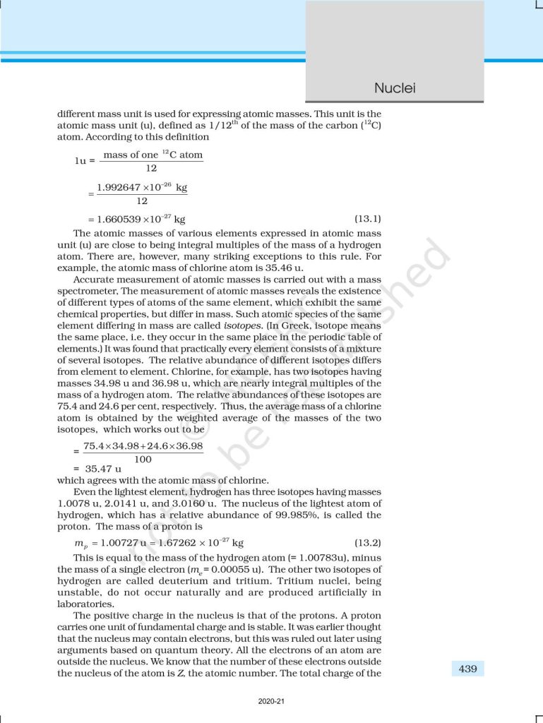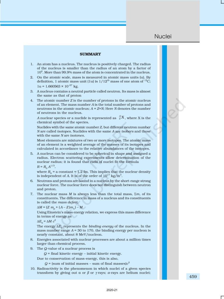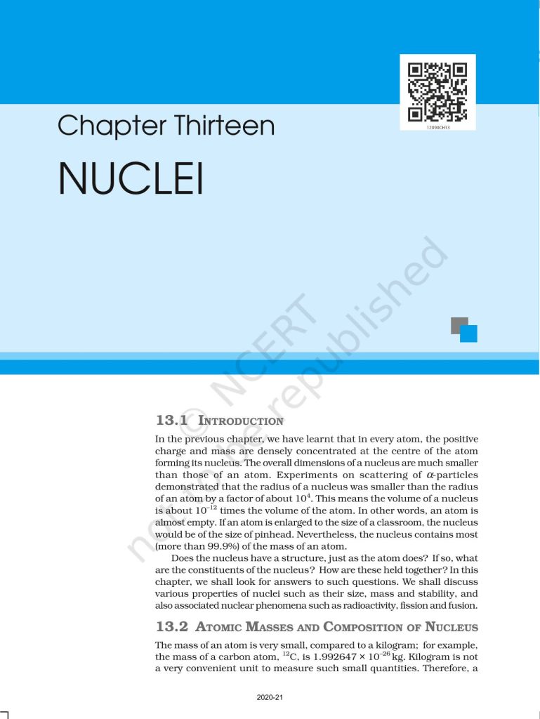This chapter deals with the composition and properties of atomic nuclei, focusing on protons and neutrons (collectively called nucleons). It explains important concepts such as atomic mass, isotopes, isobars, and nuclear size. The chapter introduces the idea of binding energy, which is the energy required to hold the nucleus together, and highlights its role in nuclear stability. It also covers mass-energy equivalence and nuclear reactions like radioactive decay, including alpha, beta, and gamma emissions. Additionally, processes such as nuclear fission and fusion are discussed, explaining how vast amounts of energy are released in these reactions. This chapter provides a fundamental understanding of nuclear physics and its practical applications in energy production and medicine. And it is important for Class 12 board exams and competitive exams like NEET and JEE.