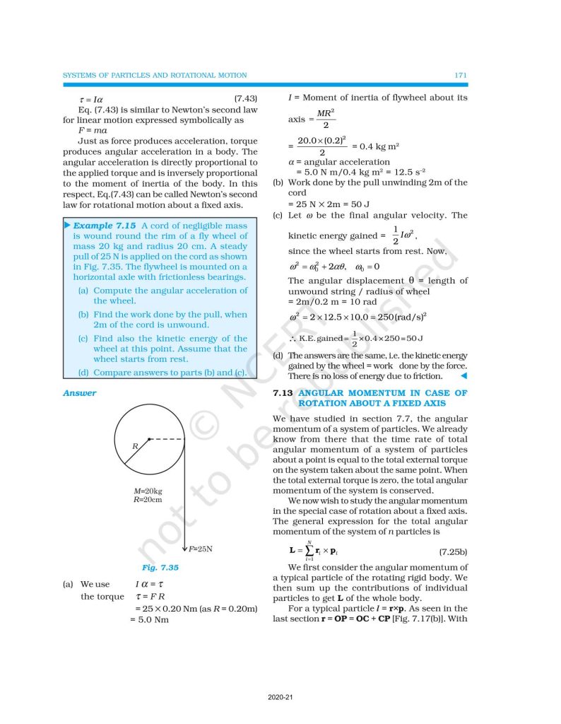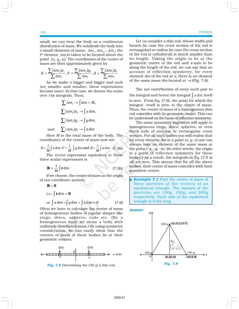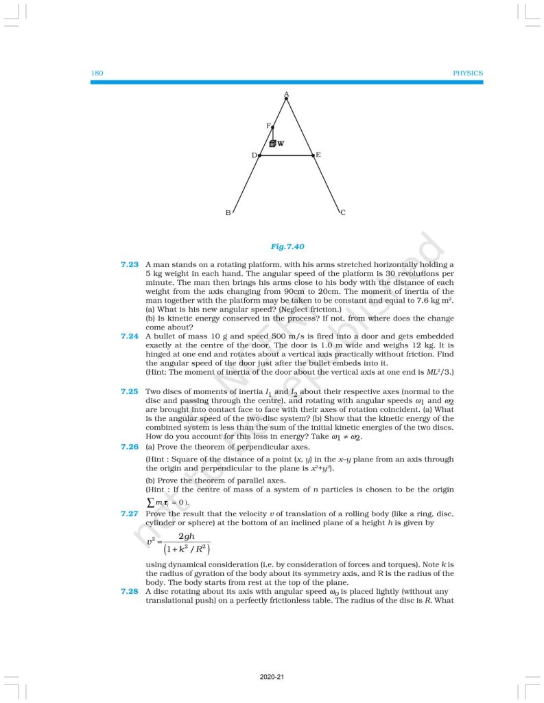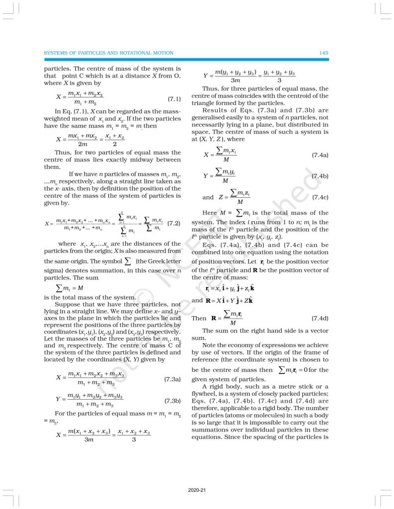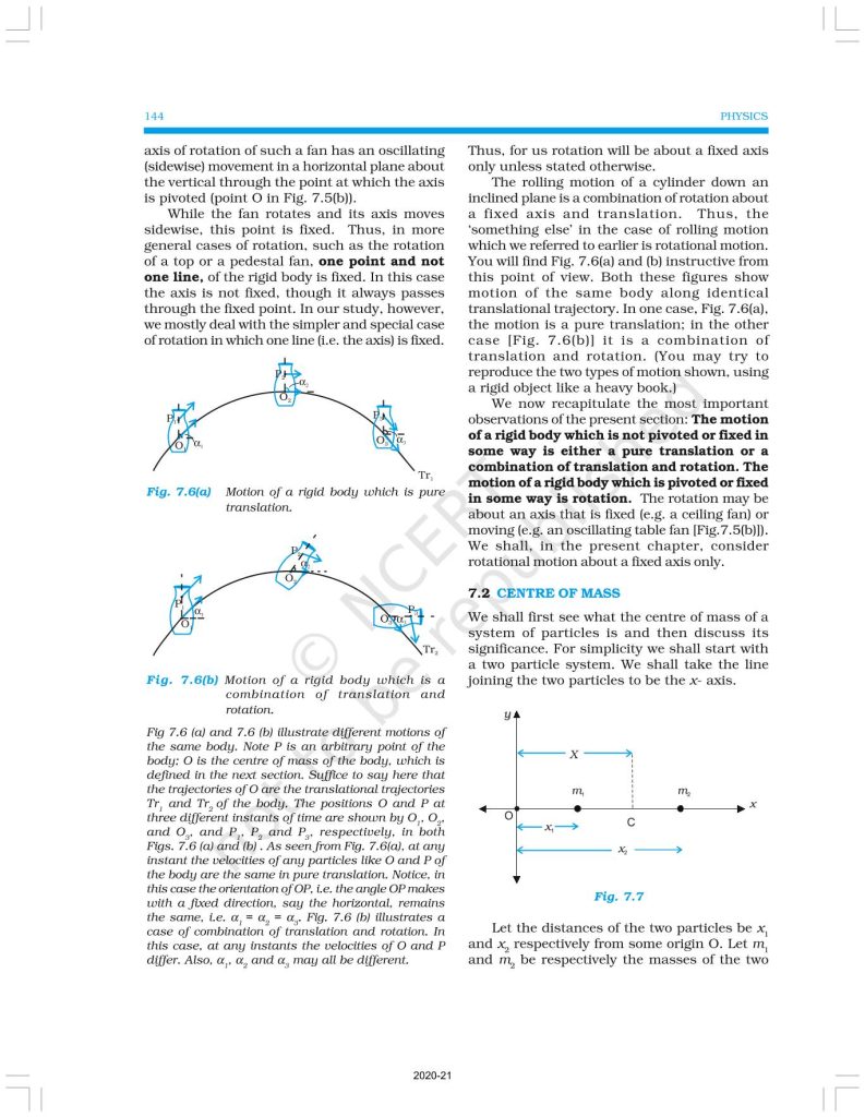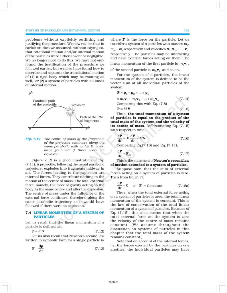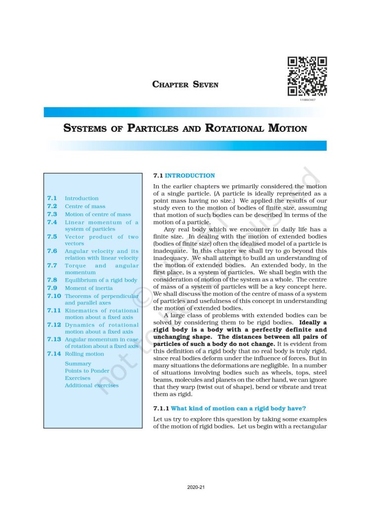 Chapter 7 – System of Particles and Rotational Motion explains the motion of systems containing multiple particles and objects undergoing rotation. It introduces concepts such as center of mass, linear momentum, and motion of a system of particles under external forces.