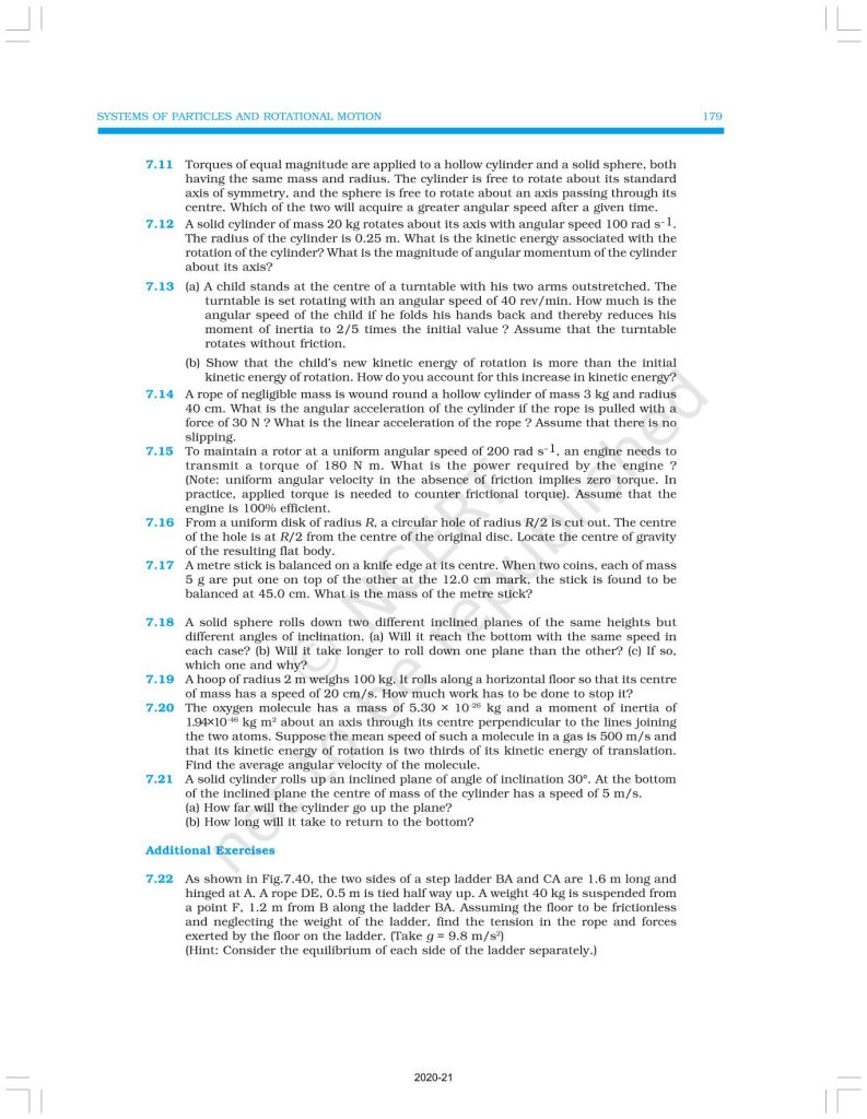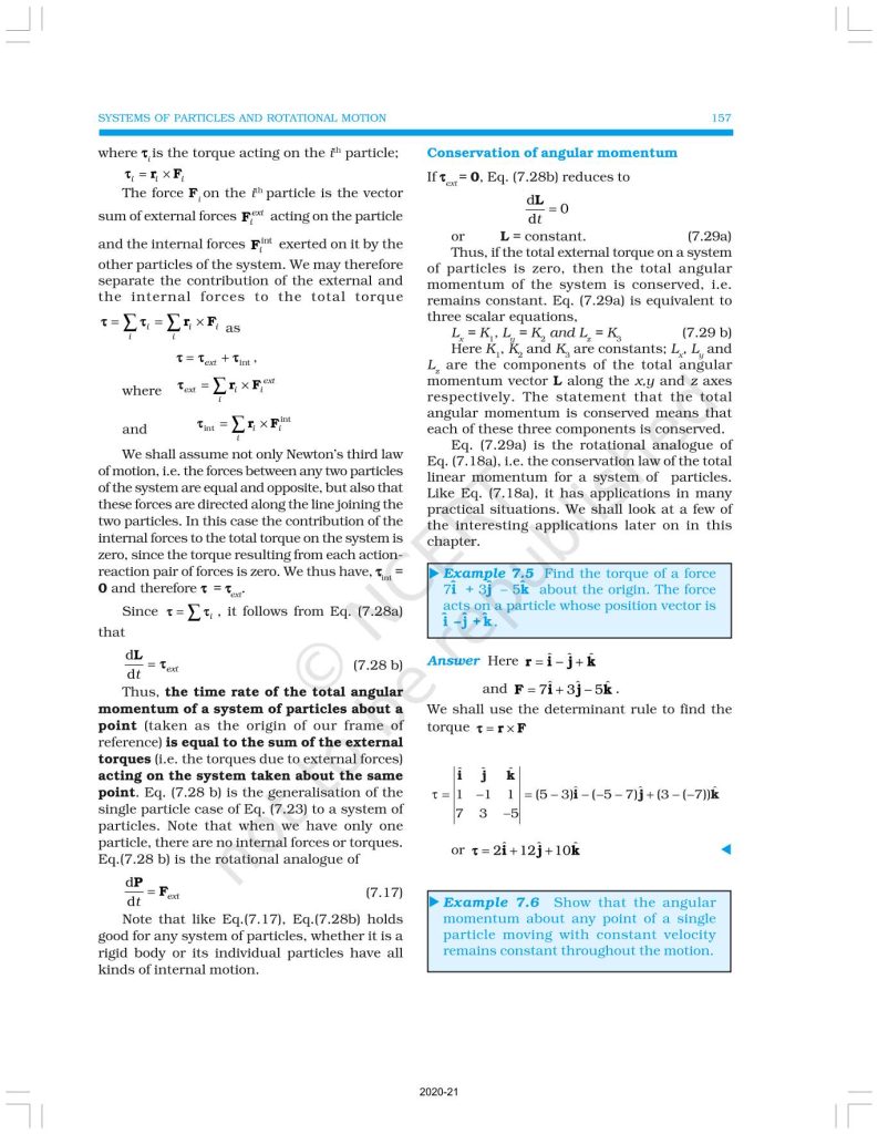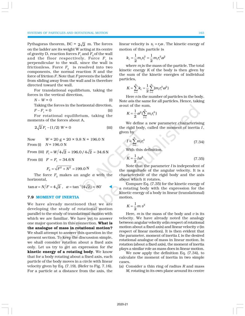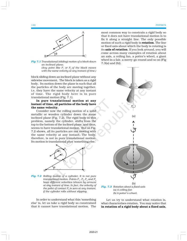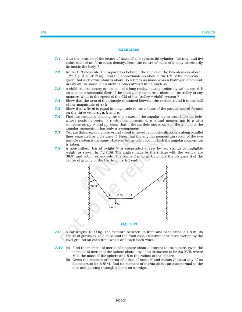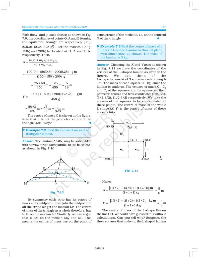 Chapter 7 – System of Particles and Rotational Motion explains the motion of systems containing multiple particles and objects undergoing rotation. It introduces concepts such as center of mass, linear momentum, and motion of a system of particles under external forces.