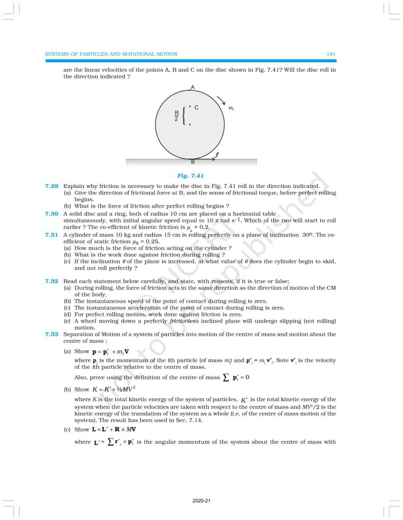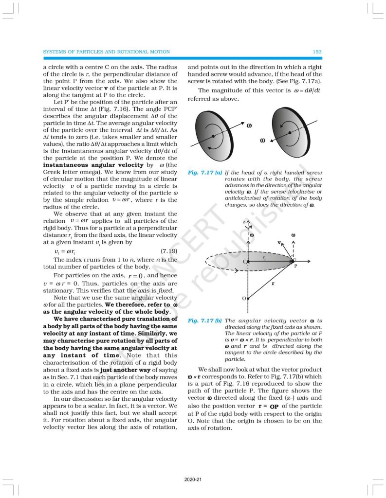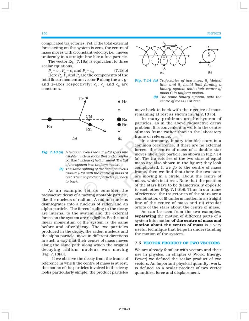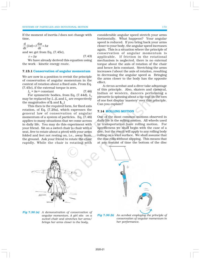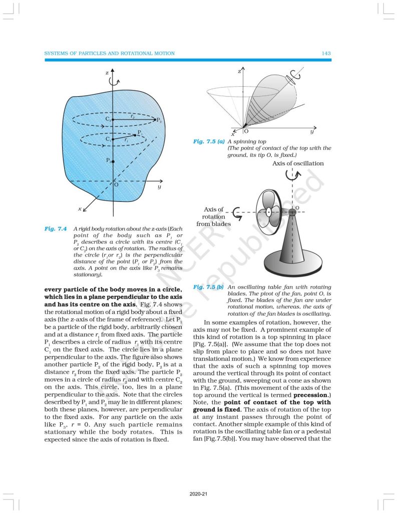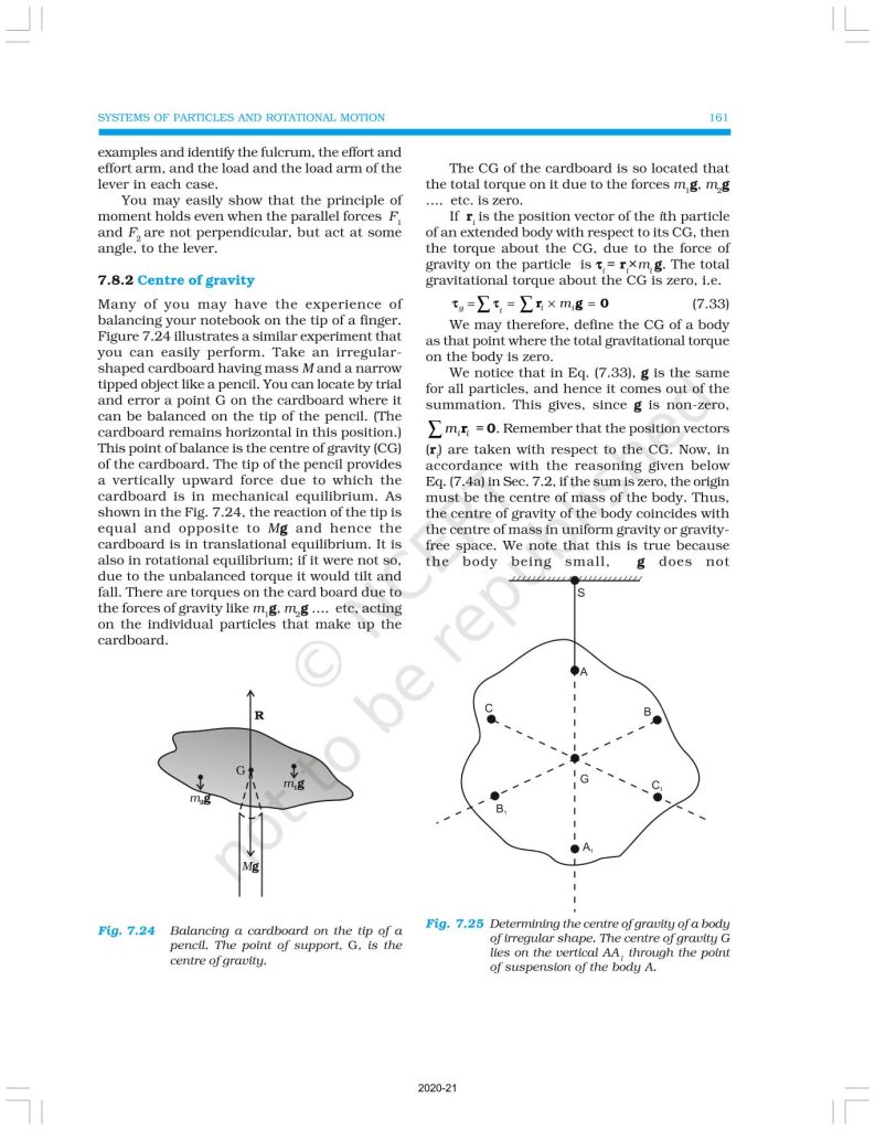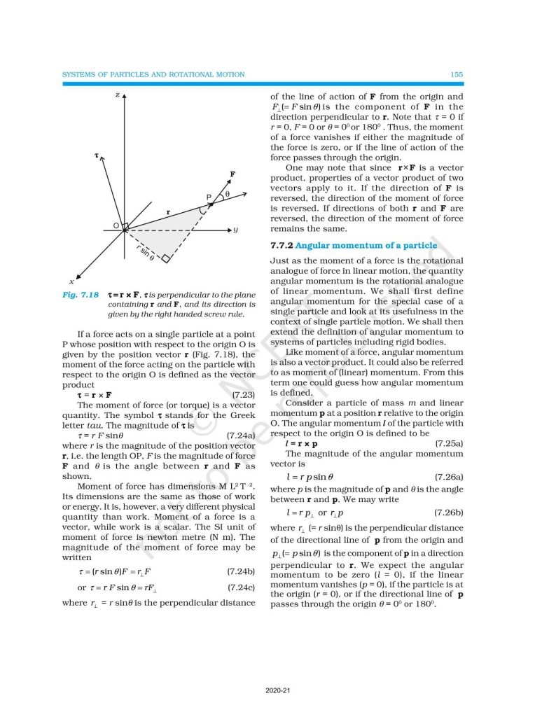 Chapter 7 – System of Particles and Rotational Motion explains the motion of systems containing multiple particles and objects undergoing rotation. It introduces concepts such as center of mass, linear momentum, and motion of a system of particles under external forces.